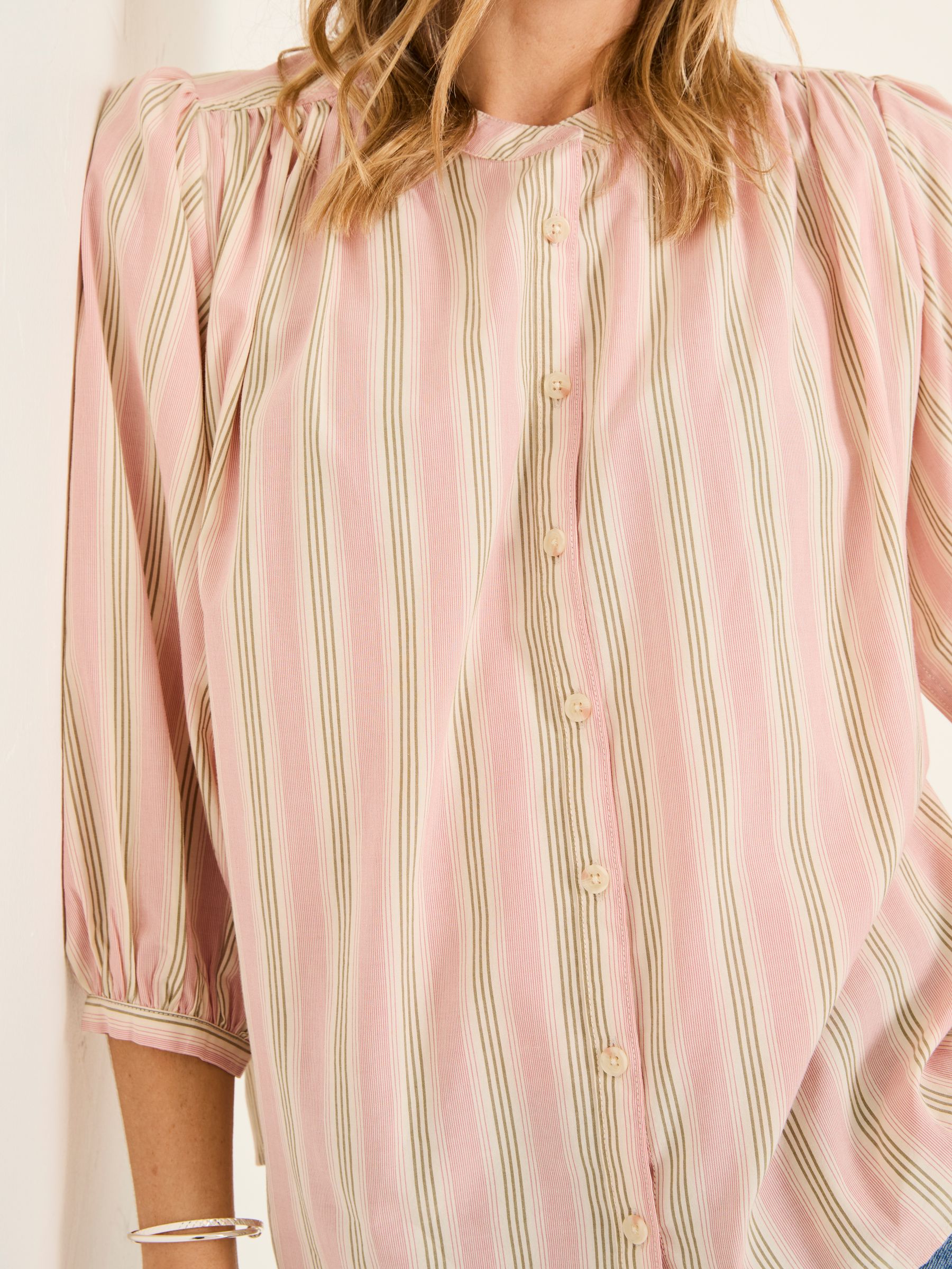 Brighten up your wardrobe in our Amy blouse, the perfect lightweight and flowy piece to elevate your outfits. She is soft and breathable and easy to be layered – perfect for all weathers. Pair with some trousers for office days or with some jeans for weekend lunches. It features a flattering V-Neck shape, a gorgeous stripe pattern and buttons down the front for a stylish, layered look.Model is 5’9”/175cm and wears UK size 8