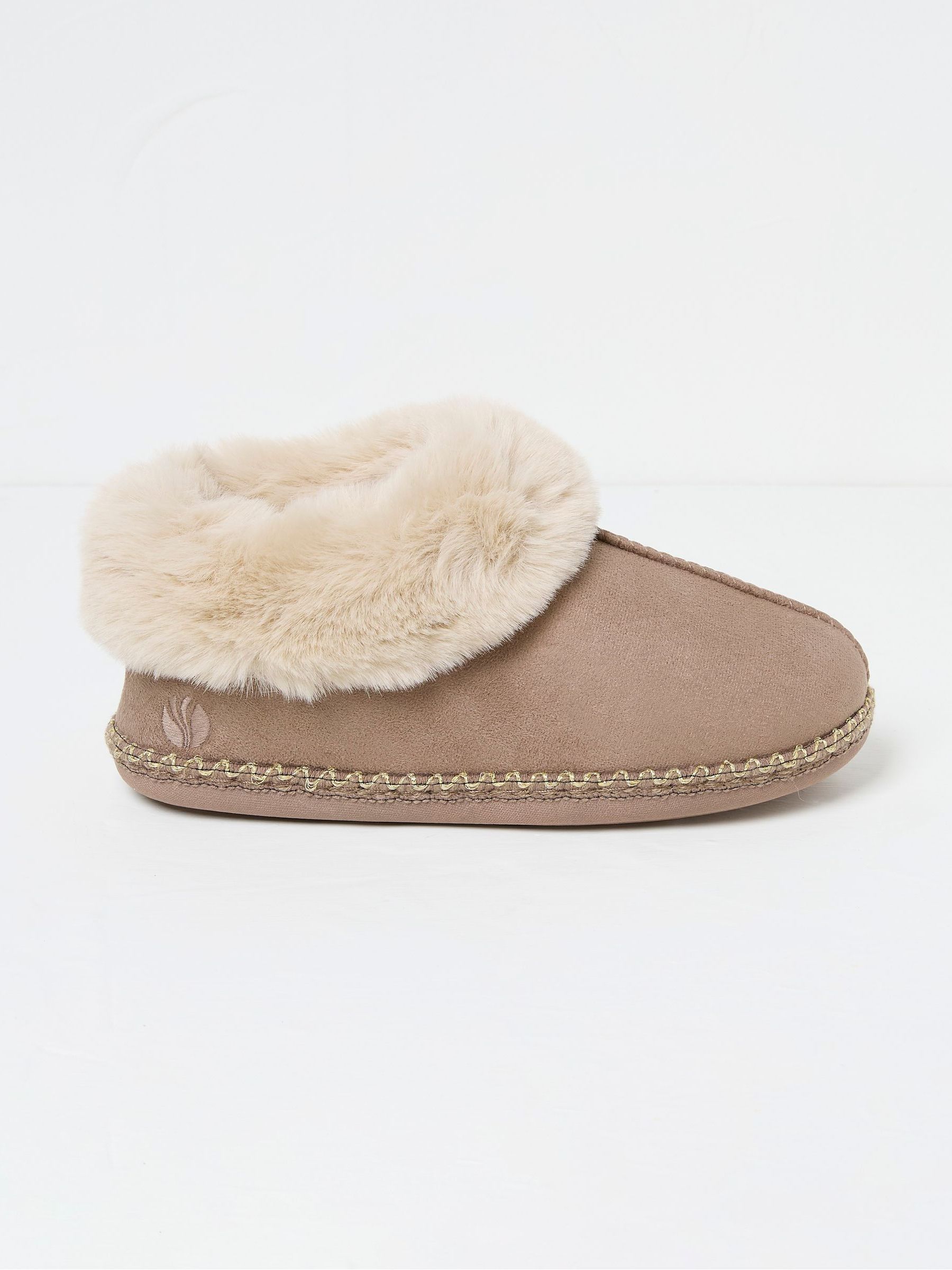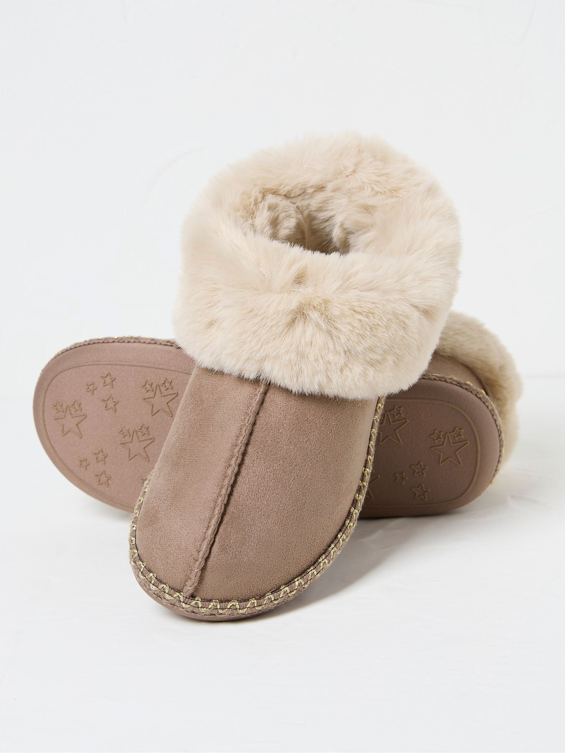 Supersoft, comfortable and with a cute faux fur trim, these slipper boots are perfect for all your cosy evenings and lazy days. They have rubber soles for grip and are finished beautifully with contrast stitch detailing.Grippy starprint solesFaux fur trimContrast stitching