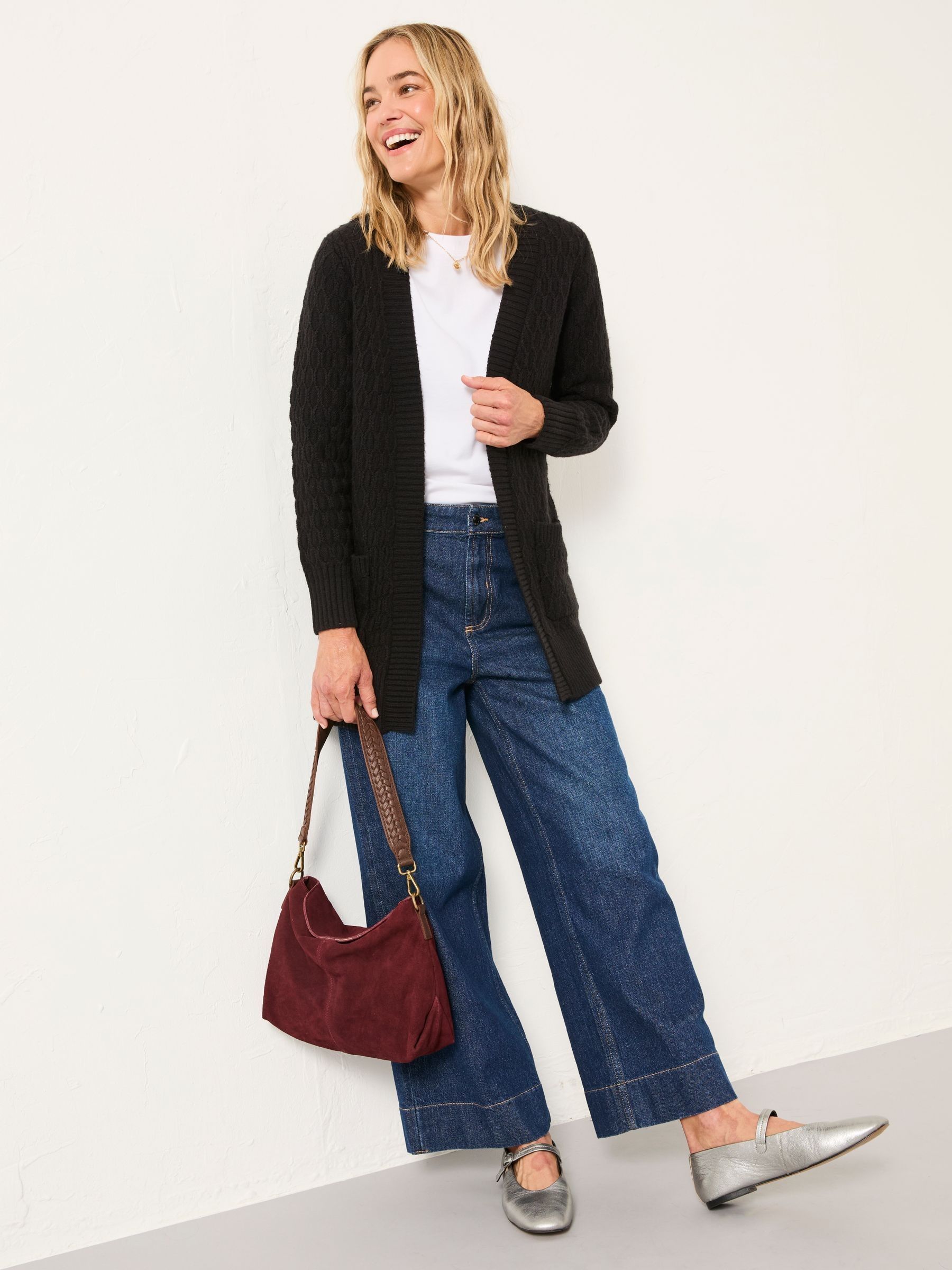 Stay cosy and stylish in our Hannah longline knitted cardigan, designed for effortless layering and everyday ease. Crafted from soft, breathable knit, it features a relaxed fit and two handy front pockets – perfect for keeping your essentials close or warming your hands on chilly days. Whether you’re running errands, working from home, or meeting friends for coffee, this versatile cardigan adds a cosy, laid-back vibe to any look.Model is 5’9”/175cm and wears UK size 8