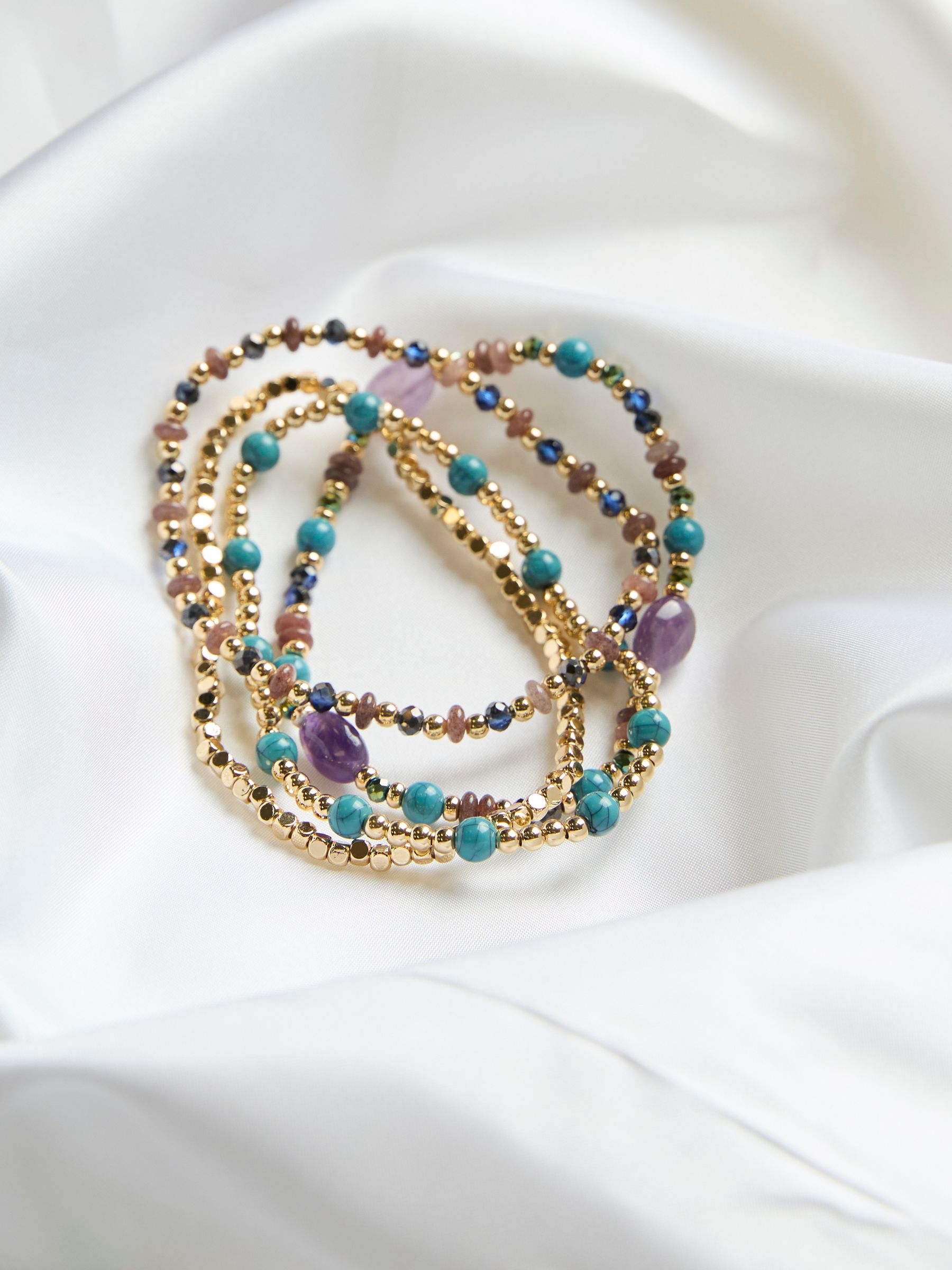 Mix, match and stack with our stretch bracelets. Gorgeous blue and purple gems alongside gold coloured jewels make for a bracelet stack perfect for elevating your look from day to night.