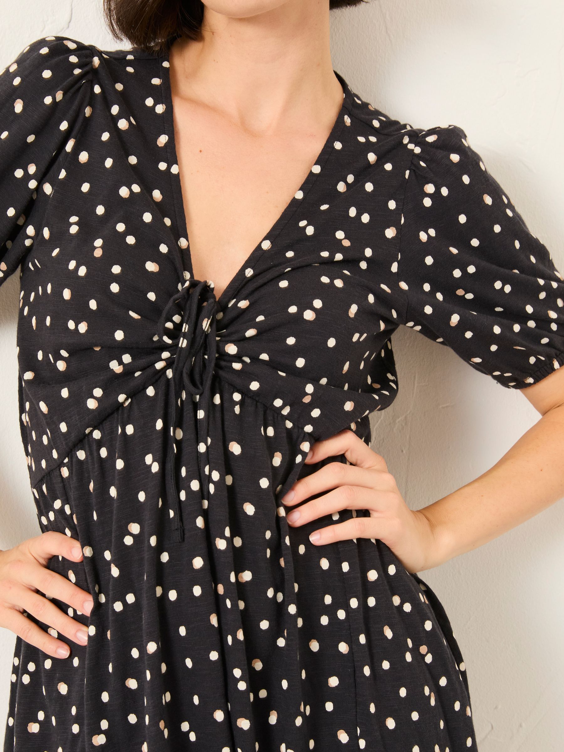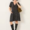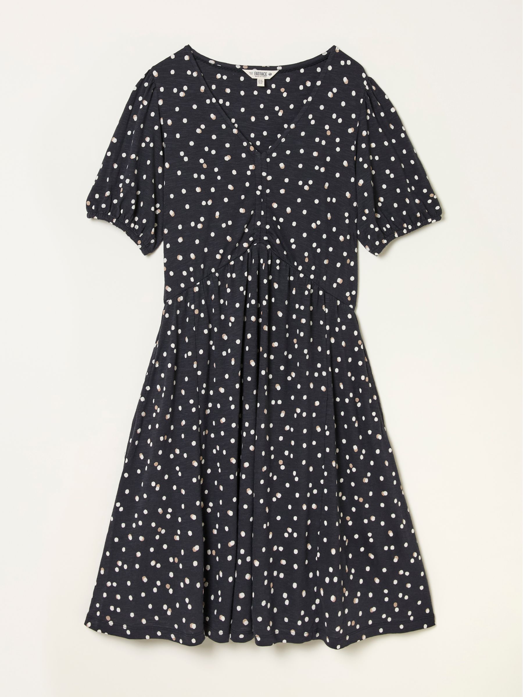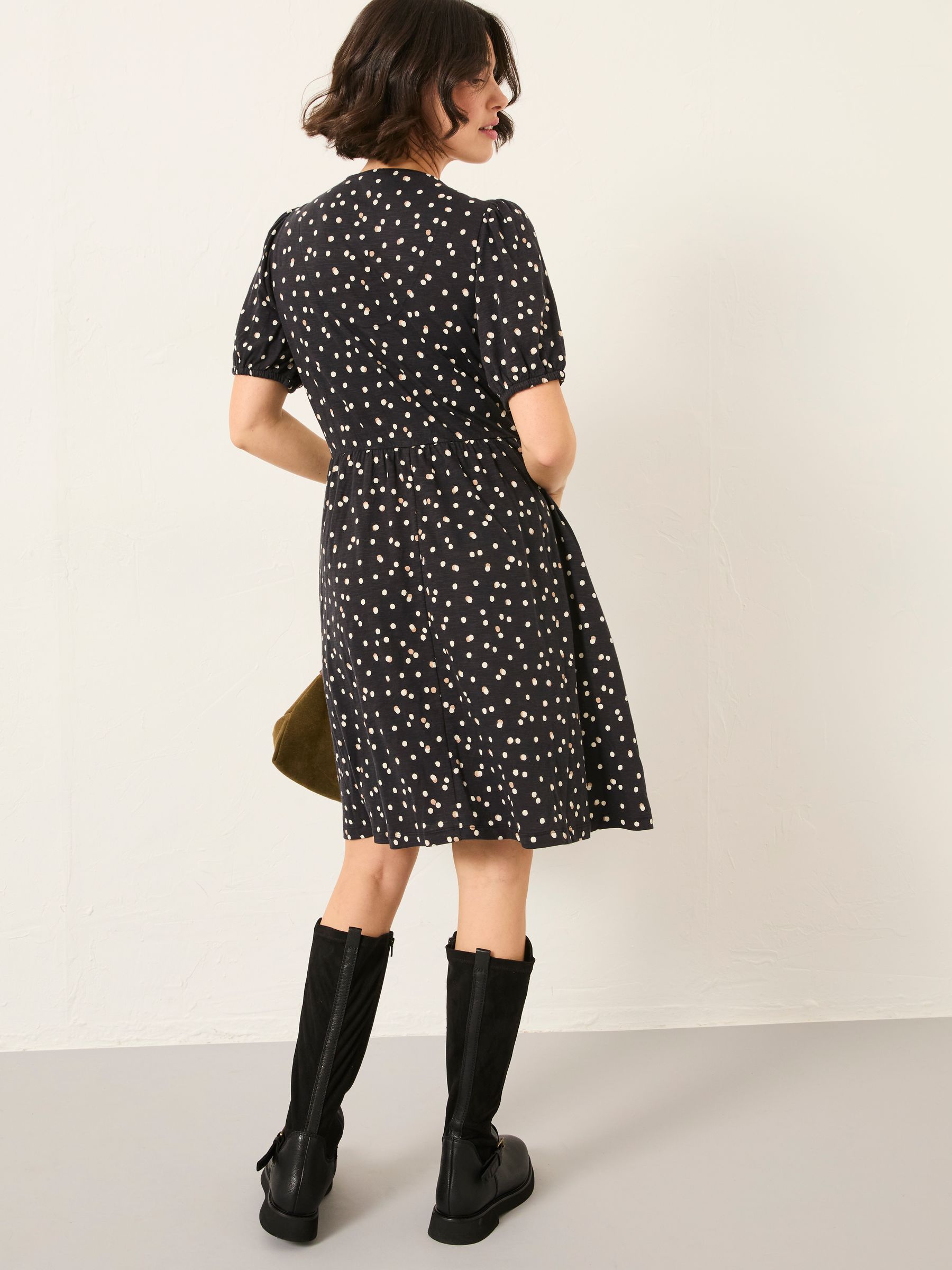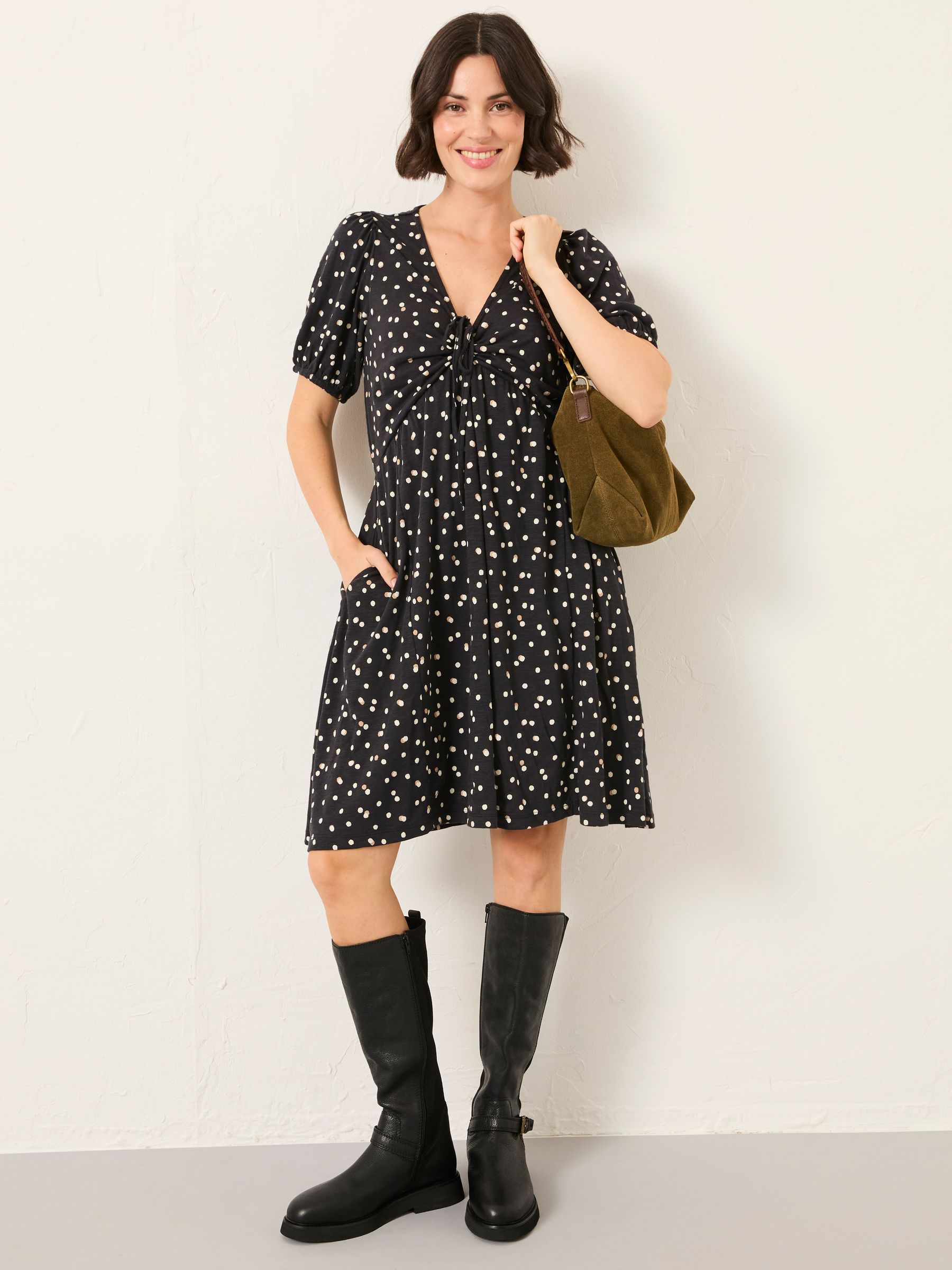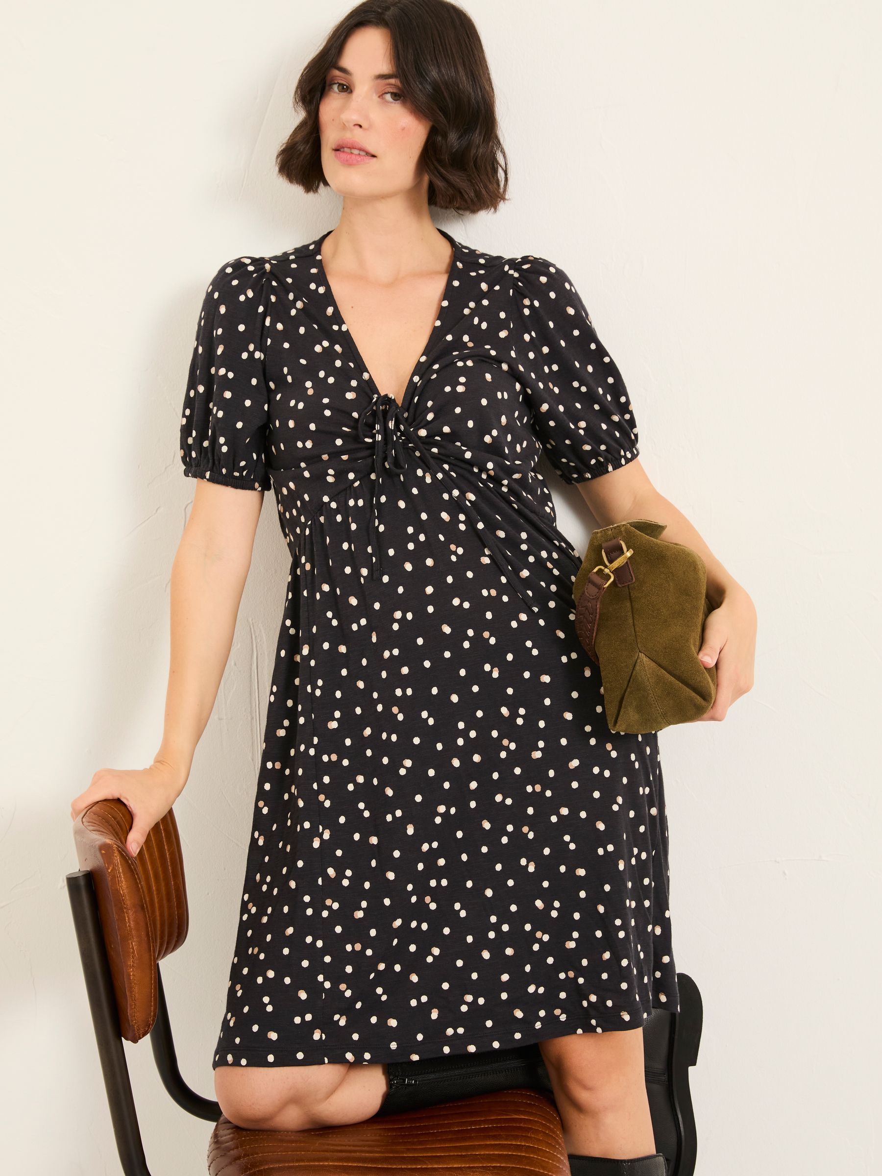 The Nell mini dress is perfect for all seasons – wear it with boots and a cardi on chillier days or wear solo with some trainers for weekend coffee runs.Featuring short sleeves, a flattering V-neckline and a soft, comfy fabric, the gorgeous print and floaty skirt makes it perfect to elevate your dress rotation.Model is 5’8”/173cm and wears UK size 8 Regular Regular side neck to hem 37.5" / 95cm.