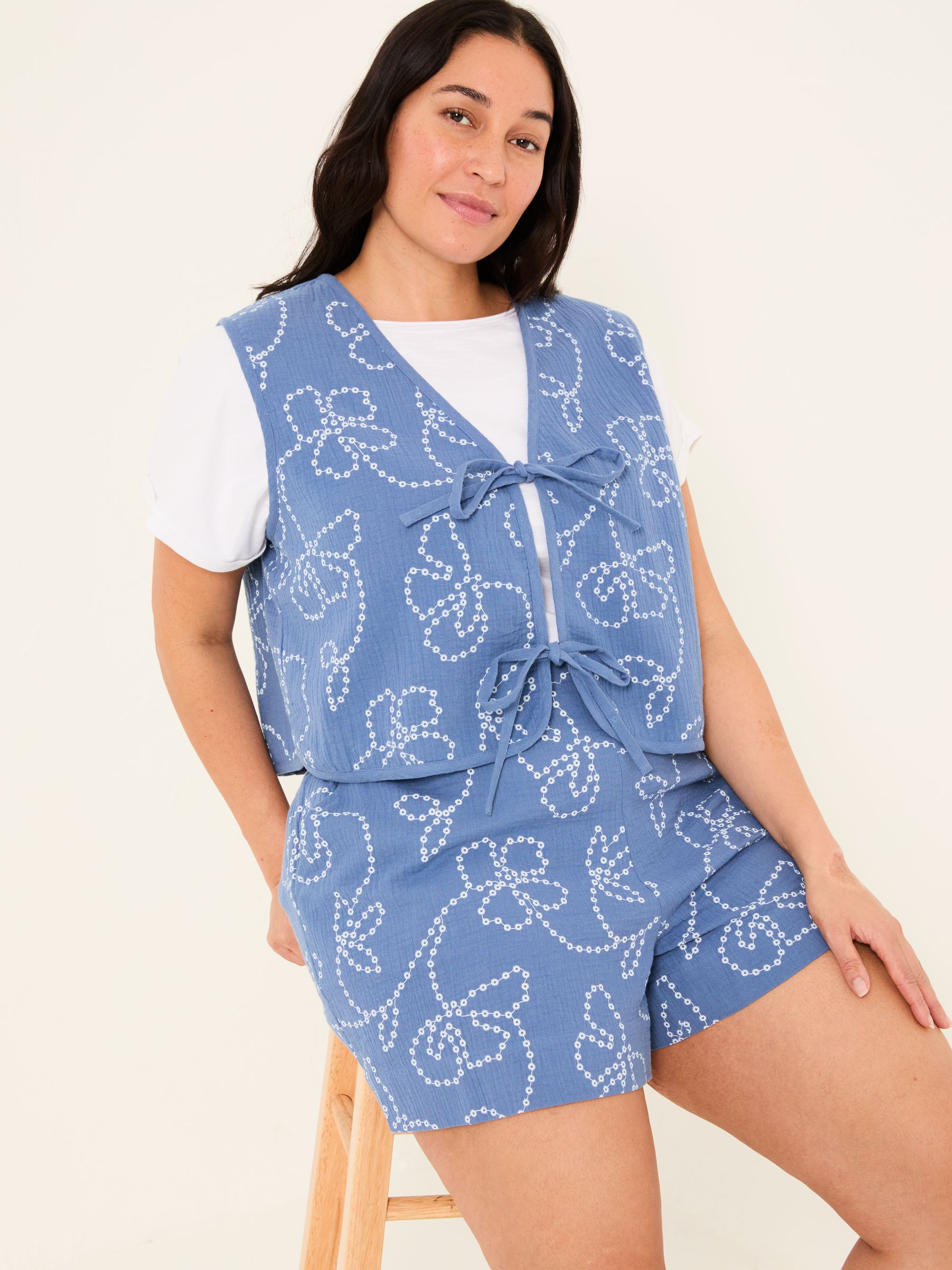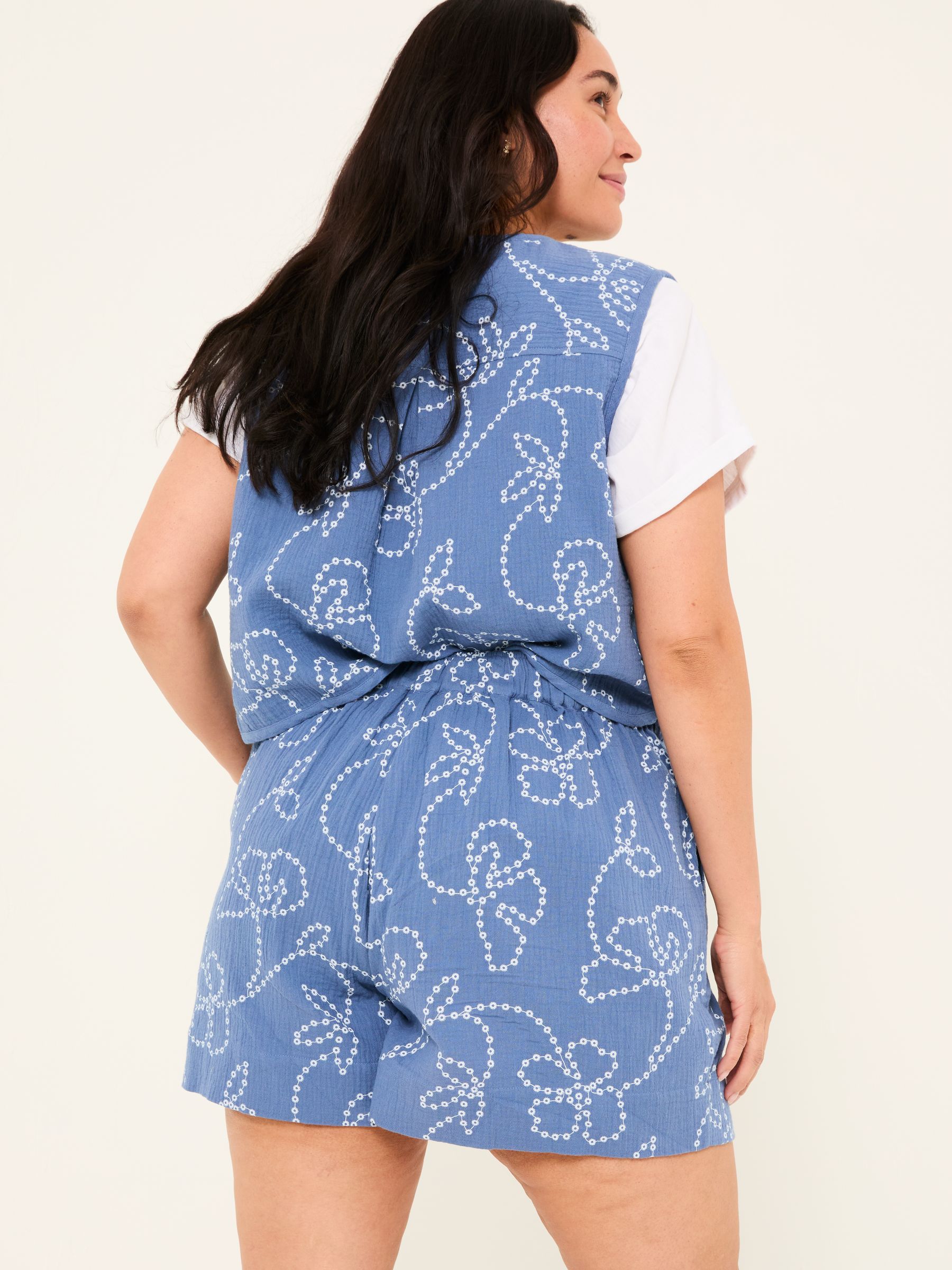 Our Rosie short is an unmissable staple. Playful flower embroidery adds a fun touch, pair with our matching waistcoat for a cute set or a basic tee. Made from a soft and breathable 100% cotton, find the flavour of summertime chic.Model is 5’8”/173cm and wears UK size 18